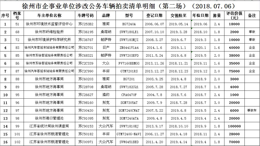 一、拍賣標的:徐州市企事業(yè)單位改革公務(wù)車輛(詳見每期拍品目錄)。