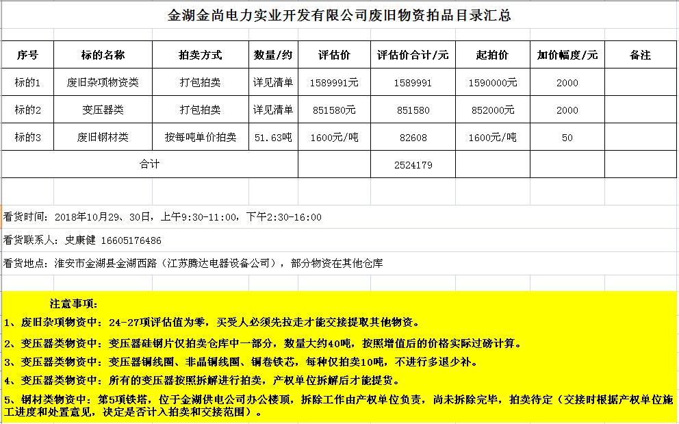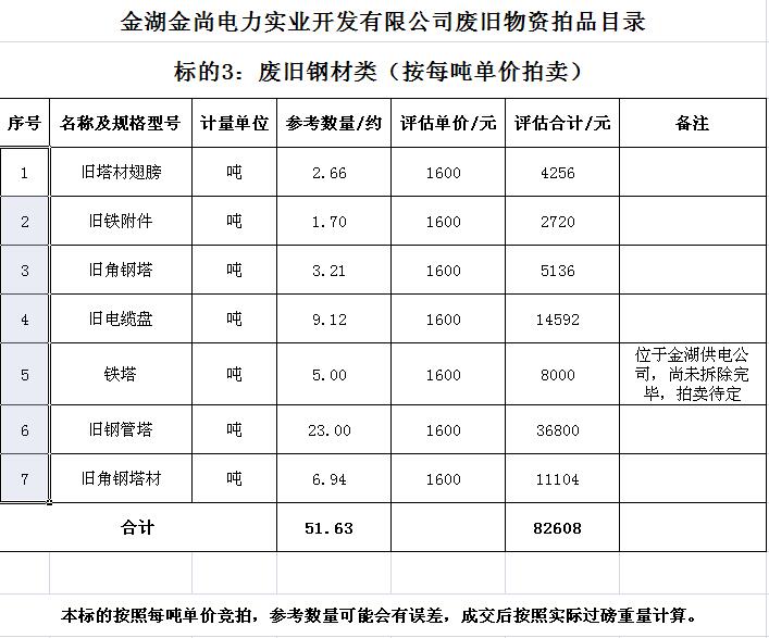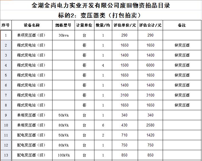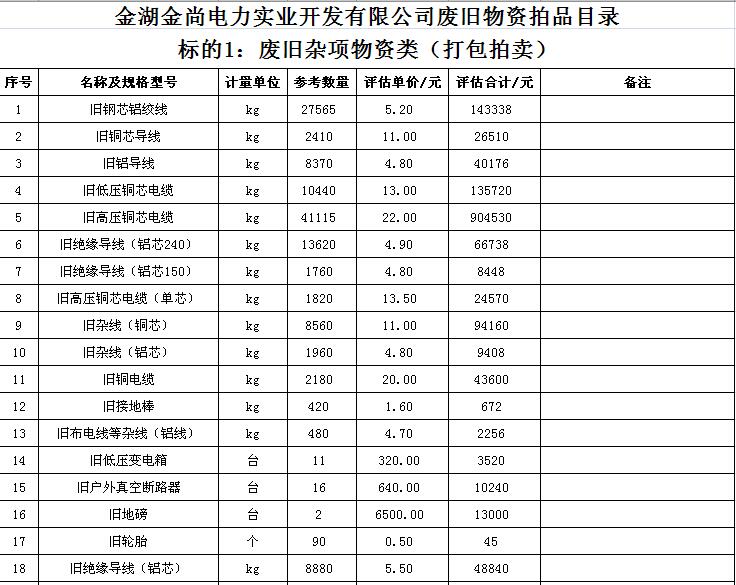 關(guān)注微信公眾號(hào)受金湖金尚電力實(shí)業(yè)開發(fā)有限公司委托,我公司將通過中國拍賣行業(yè)協(xié)會(huì)網(wǎng)絡(luò)拍賣平臺(tái)以網(wǎng)絡(luò)競價(jià)的方式公開拍賣廢舊物資一批,主要包括:電纜、導(dǎo)線、鋼芯鋁絞線、角鋼塔、鐵附件、金具、變壓器、箱式變電站、空調(diào)、電腦等(詳見拍品目錄)。