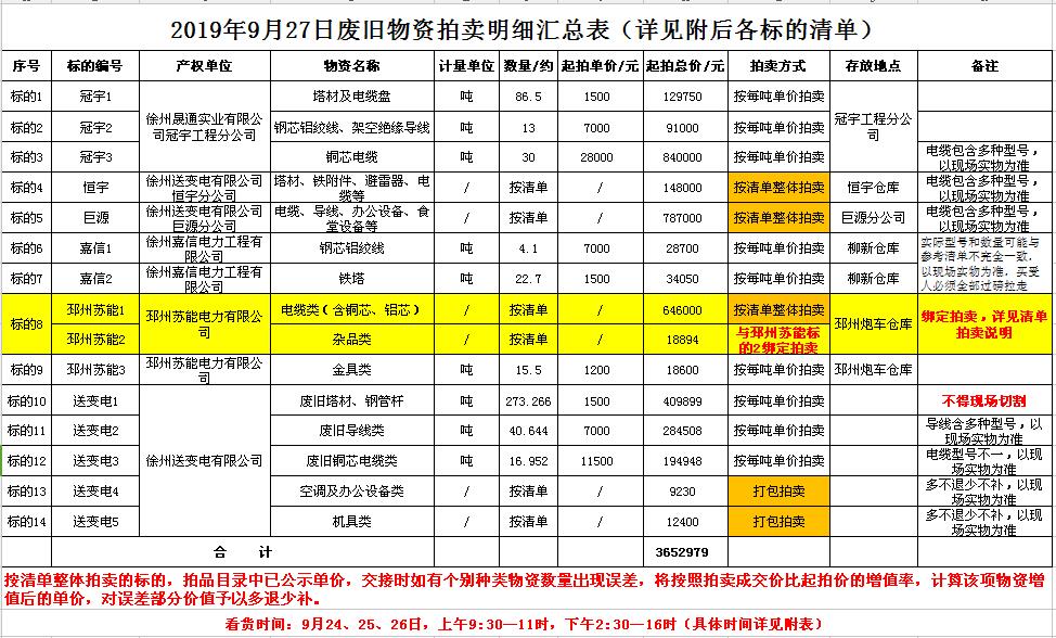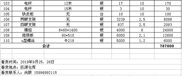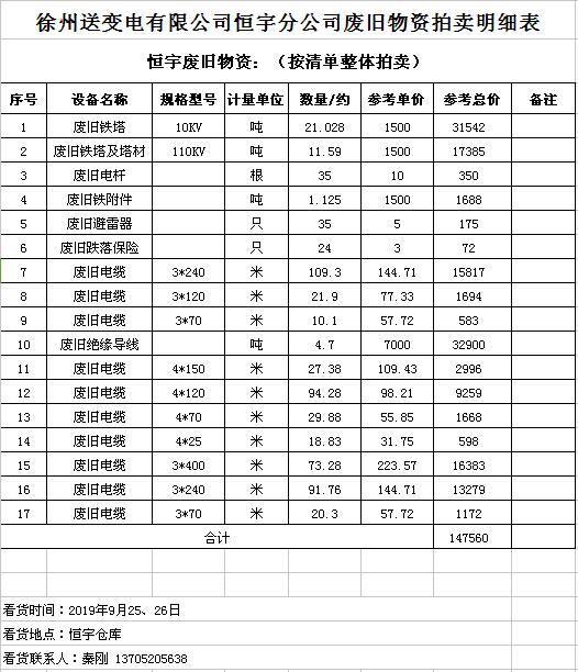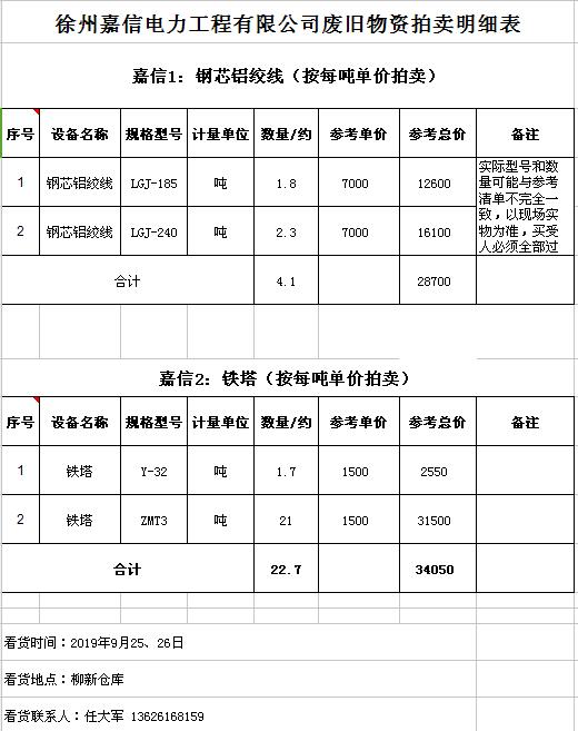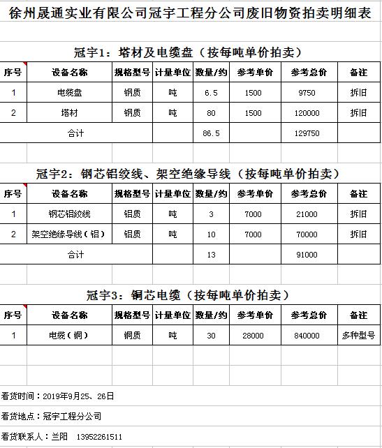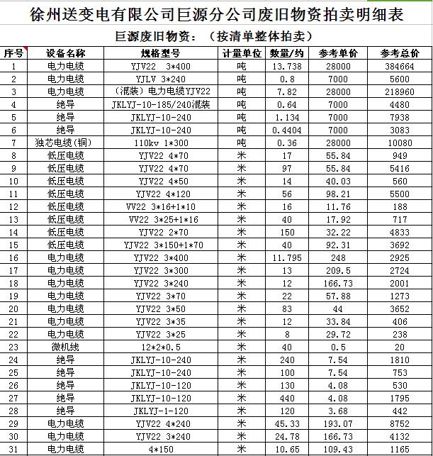 關注微信公眾號受委托,我公司將通過中國拍賣行業(yè)協(xié)會網(wǎng)絡拍賣平臺以網(wǎng)絡競價的方式公開拍賣廢舊電力物資一批,主要包括:電纜、導線、廢舊鋼材、鋼芯鋁絞線、金具、雜品、機具、空調(diào)、辦公設備等。