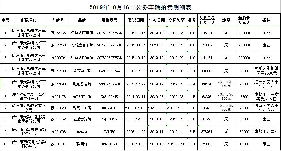 關注微信公眾號受委托,我公司定于2019年10月16日13:00時在徐州市銀地二手車交易市場四樓東南拍賣大廳通過現(xiàn)場和汽車街網(wǎng)絡拍賣平臺同步進行的方式公開拍賣以下公務車輛: