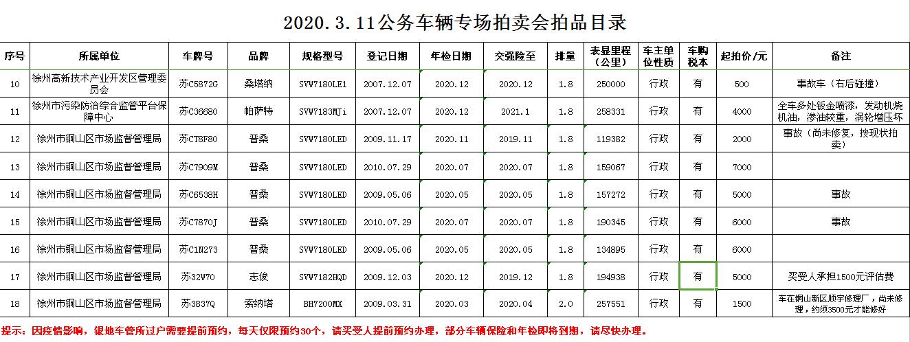 受委托,我公司定于2020年3月11日13:00時(shí)在徐州市銀地二手車(chē)交易市場(chǎng)四樓東南拍賣(mài)大廳通過(guò)現(xiàn)場(chǎng)和汽車(chē)街網(wǎng)絡(luò)拍賣(mài)平臺(tái)同步進(jìn)行的方式公開(kāi)拍賣(mài)以下公務(wù)車(chē)輛: