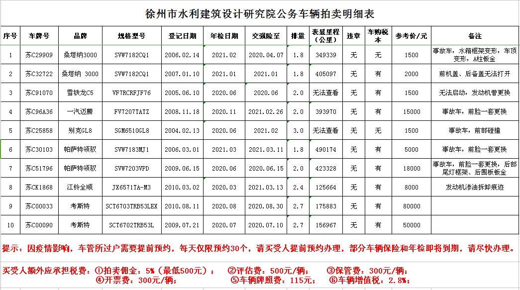 關(guān)注微信公眾號(hào)受委托,我公司定于2020年4月1日13:00時(shí)在徐州市銀地二手車(chē)交易市場(chǎng)四樓東南拍賣(mài)大廳通過(guò)現(xiàn)場(chǎng)和汽車(chē)街網(wǎng)絡(luò)拍賣(mài)平臺(tái)同步進(jìn)行的方式公開(kāi)拍賣(mài):徐州市水利建筑設(shè)計(jì)研究院公務(wù)車(chē)輛10輛,主要車(chē)型有帕薩特、桑塔納、雪鐵龍C5、邁騰、全順、GL8、考斯特等。
