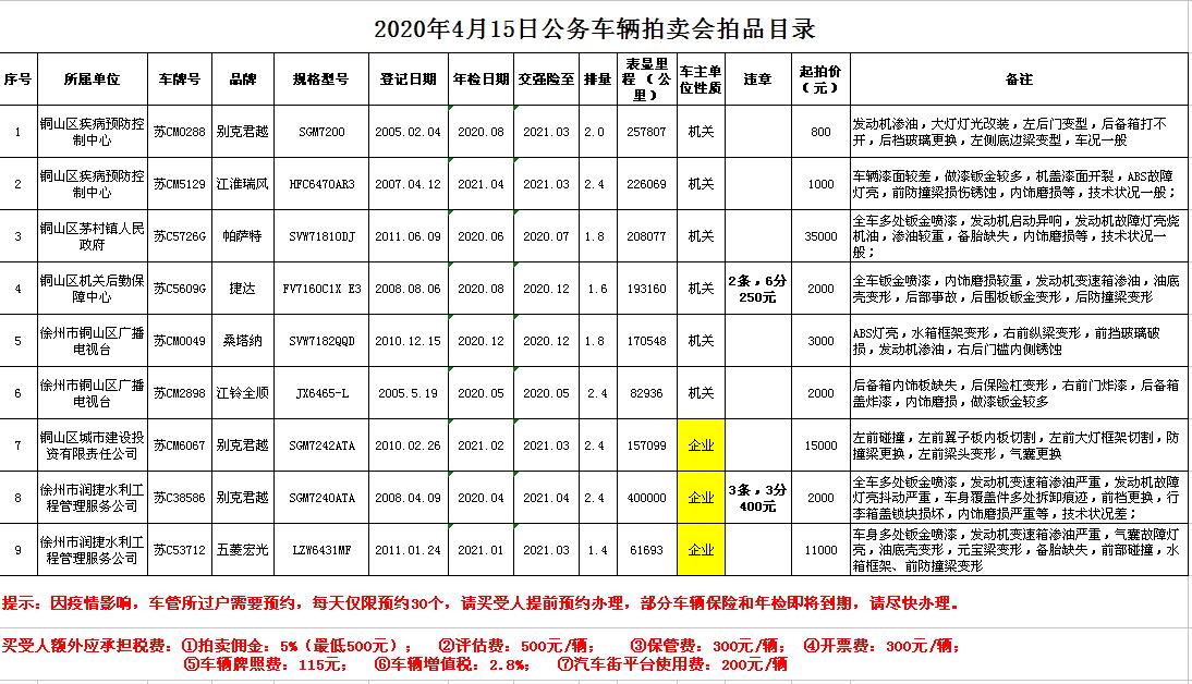 關(guān)注微信公眾號(hào)受委托,我公司定于2020年4月15日13:30時(shí)在徐州市銀地二手車(chē)交易市場(chǎng)四樓東南拍賣(mài)大廳通過(guò)現(xiàn)場(chǎng)和汽車(chē)街網(wǎng)絡(luò)拍賣(mài)平臺(tái)同步進(jìn)行的方式公開(kāi)拍賣(mài)以下車(chē)輛:①05年蘇CM0288君越;②07年蘇CM5129江淮瑞風(fēng);③11年蘇C5726G帕薩特;④10年蘇CM6067君越;⑤08年蘇C38586君越;⑥11年蘇C53712五菱宏光;⑦08年蘇C5609G捷達(dá);⑧10年蘇CM0049桑塔納;⑨05年蘇CM2898江鈴全順。