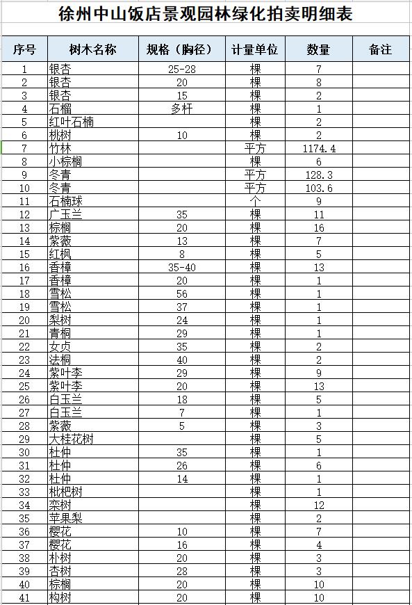 關(guān)注微信公眾號(hào) 受委托,我公司定于2021年5月8日10通過(guò)中拍平臺(tái)公開(kāi)拍賣:徐州市中山飯店景觀樹(shù)一批。主要包含:銀杏、廣玉蘭、冬青、紫薇、香樟、梨樹(shù)、松鼠、青桐、女貞、法桐、白玉蘭、杜仲、水杉、冬青、海棠、竹林等。