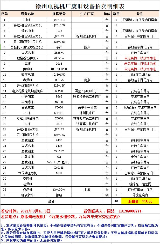 關(guān)注微信公眾號我公司受委托,定于2021年8月6日上午10時(延時除外)在中拍平臺公開拍賣:徐州電視機廠廢舊設(shè)備一批。主要包含:沖床、壓力機、折邊機、鉆床、機床、車床、刨床、磨床、銑床等、空壓機、電焊機等。