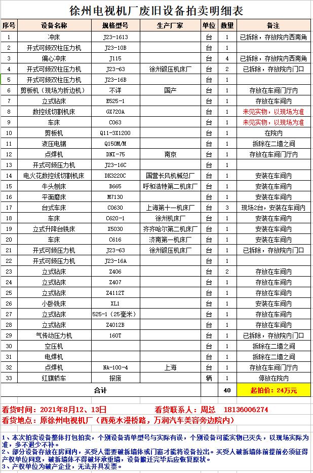 1、徐州電視機廠廢舊設(shè)備一批。包含:沖床、壓力機、折邊機、鉆床、機床、車床、刨床、磨床、銑床等、空壓機、電焊機等。(競買人須為具有再生資源回收資質(zhì)的企業(yè)法人),保證金5萬元。